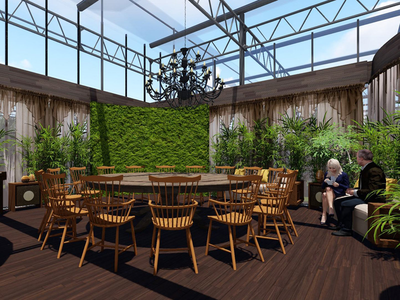 綠色生態餐廳完全按照標準溫室的結構建造,多采用文洛式,覆蓋材料多為PC板或者玻璃,結構保溫性能好,整齊規范,室內各個空間溫度均勻,有利于景觀植物的生長,鑒于餐飲布局的需要,在文洛溫室結構的基礎上,可進行局部調整。該溫室建造成本相對較低,溫室升降溫能耗低,節約后期運行費用。